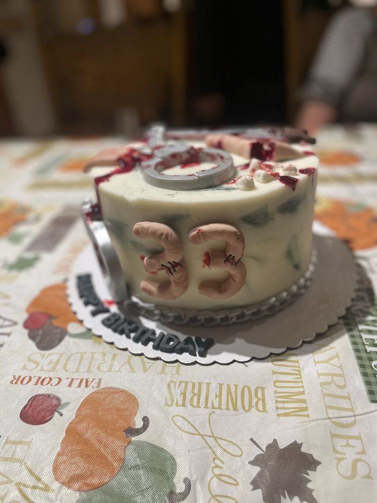 Banana cake filled with Bavarian cream, topped with cinnamon roll buttercream.